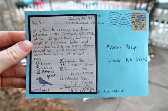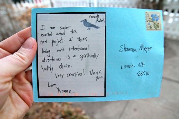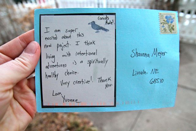 I love concept gifts.  They are the best.  For Christmas this year, my sister, Shaunna, gave me an invitation to 24 adventures yet to be determined and a kit which included a corvid mascot (black crow in this case), a roll of 24 postcard stamps and a small black journal.  A couple of days ago, I received my first postcard invitation to adventure.
