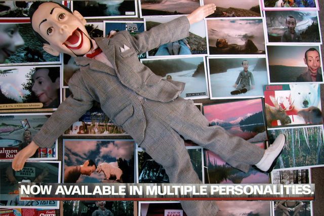 This project began as a practical joke.  A friend treated a collection of  her closest family and friends to a fabulous Fourth of July celebration at her home.   Her hospitality was repayed with the merciless kidnapping of her cherished Pee Wee  Herman doll.  It so happens that I was shortly thereafter leaving on a road trip to Alaska.  The ransom notes arrived as photo postcards of his travels with text and images culled from ubiquitous tourist literature gathered along the way.  Who knew where it would lead!