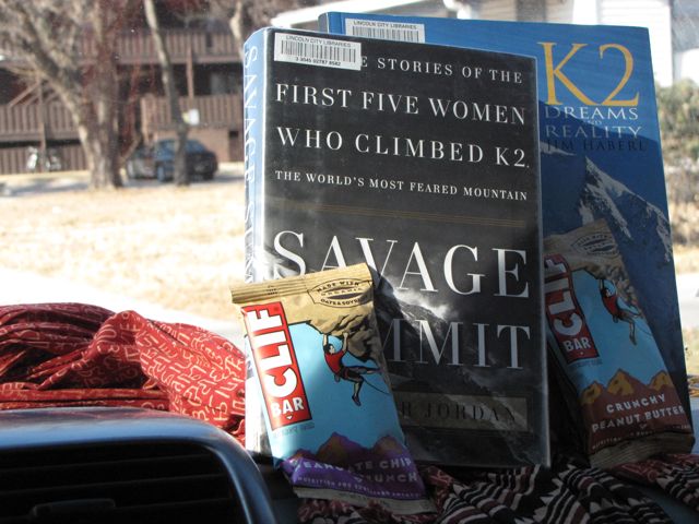 She arrived with the mysterious announcement that only 6 women in the world have successfully done what we would attempt today.  There was a small tableaux of K2 related objects:  Pakistani scarf, Cliff Bars and books on the mountain, K2.  She handed me a Lincoln Telephone book and directed me to find K2.  (There is a city map in the middle of the book.)  She said she hadn’t peeked ahead of time.