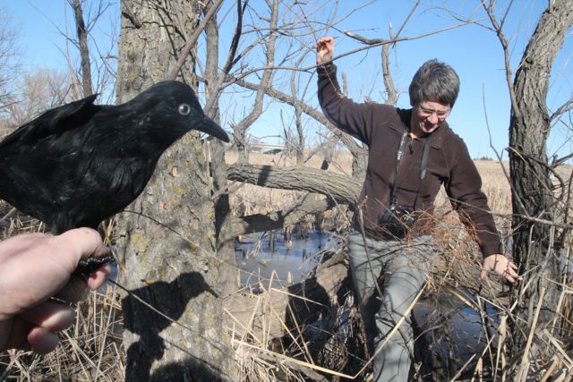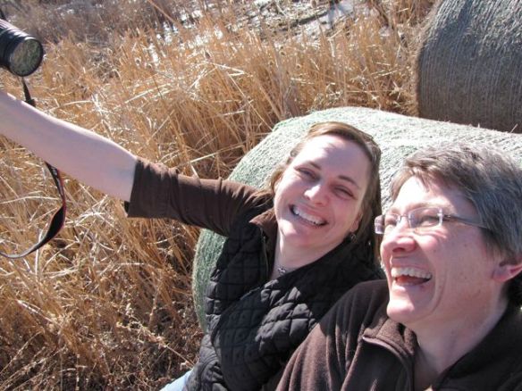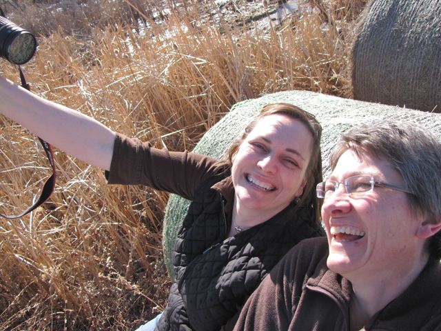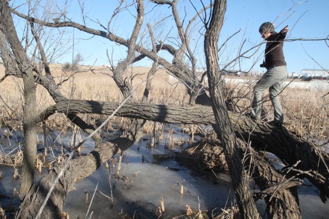 Though warm for January (44 degrees), the wind made the sunny day quite brisk.  We explored some round bales and the serpentine willows that arch over the muskrat lodges.  The pond was frozen with dry cat tales blowing in the wind.