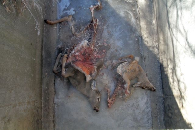 Our next stop was at a small creek that runs under 40th street to see what we could see.  I first saw a deer frozen in a death rictus.  Then another and another.  We counted six dead white tail deer including does and fawns that appear to have been dumped here without having been butchered, though coyotes clearly visit this place at lonelier times of day.  It felt a little dreadful.