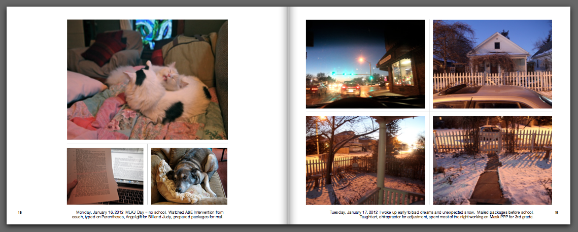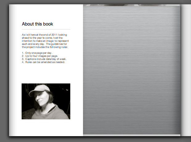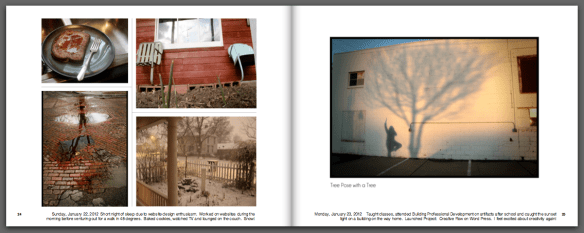 I do like to stop at the passing of one year into the next to account for my living.  Sometimes, this takes the form of a New Year’s Resolution but more often, it is a looking back to make sense of what I have done, where this has gotten me and the setting of intentions for where I would like to be in the future.  As part of this process, I decided to merge my interest in editing images into books with a daily mandate to photograph my everyday life.