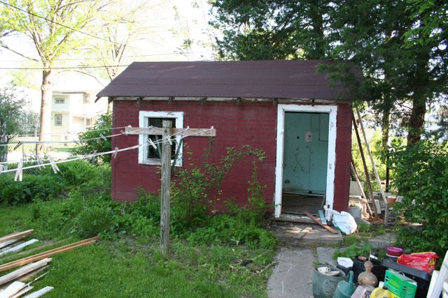 I asked the few remaining old timers in the neighborhood for stories and was delighted to learn that the 9×14′ shed had been used as a living space by a young, newly wed couple for several years.  It was charming with a turquoise interior and old screen doors on two sides of the building.  I very much wanted to save this outbuilding and use it for a garden shed.