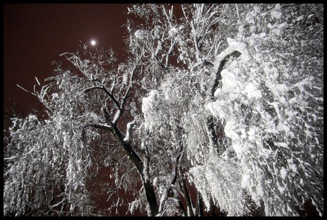 I took another walk about in the evening after dark.  It was a muffled and beautiful world.  Like Joel Meyerowitz, I too love it when artificial and natural light mingle in unanticipated ways.  Using only available light and long exposures, I delighted in the strange colors  being bounced around and reflected by the snow.  The cloud curtain became sheer and the moon started making guest appearances above the parking lot trees.  I would have done a cartwheel in response if only my boots were not so heavy.